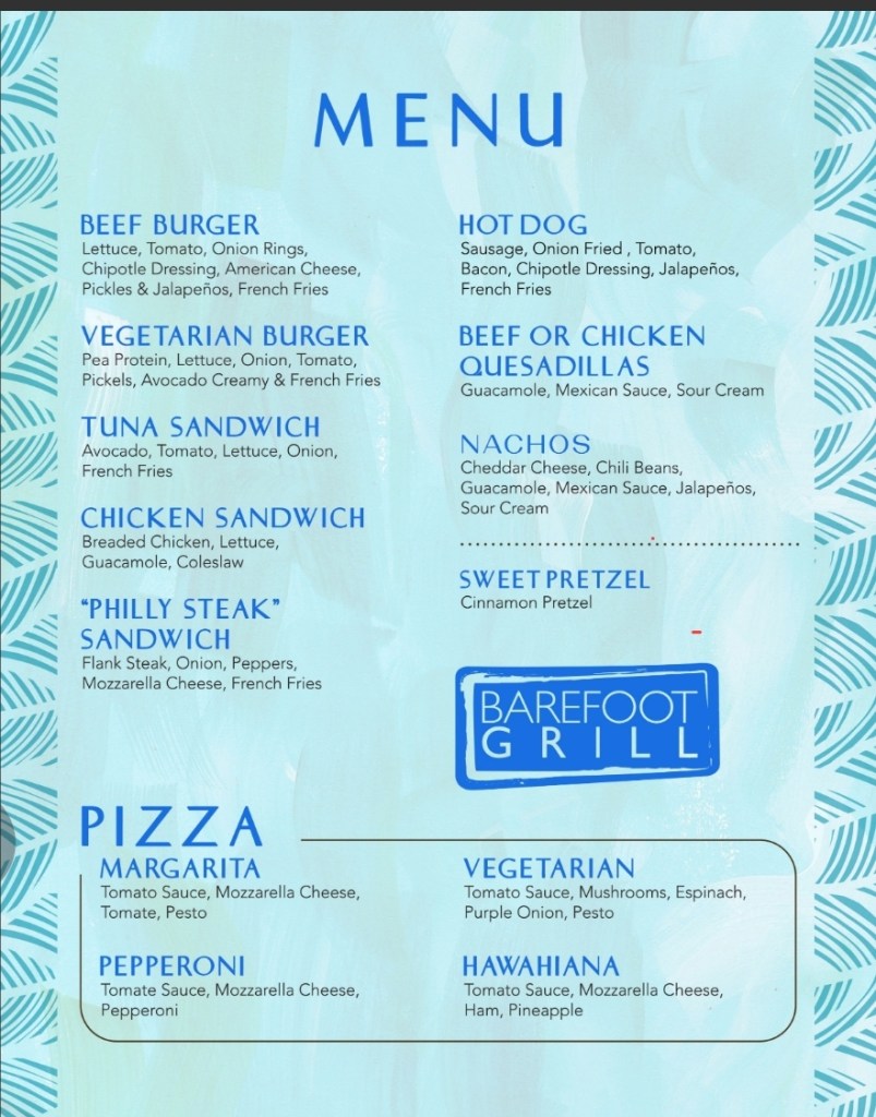 For casual poolside and beachfront dining, Barefoot Grill serves up delicious grilled favorites perfect for refueling between dips in the sun. Sink your teeth into their juicy Beef Burger topped with chipotle dressing, American cheese, and crispy onion rings, or try the Vegetarian Burger featuring pea protein and creamy avocado. Seafood lovers will enjoy the Tuna Sandwich packed with fresh avocado and veggies, while the “Philly Steak” Sandwich delivers savory flank steak with melted mozzarella. Don’t miss their loaded Nachos smothered in cheddar, chili beans, guacamole, and jalapeños – perfect for sharing. Pair your meal with refreshing cocktails like the Beach Comber (vodka, rum, and tropical fruit purées) or the Mexican Hat (tequila and coffee liqueur with evaporated milk) for the ultimate laid-back vibe. Open from lunch through late afternoon, it’s the ideal spot for a quick, satisfying bite without leaving your lounger.