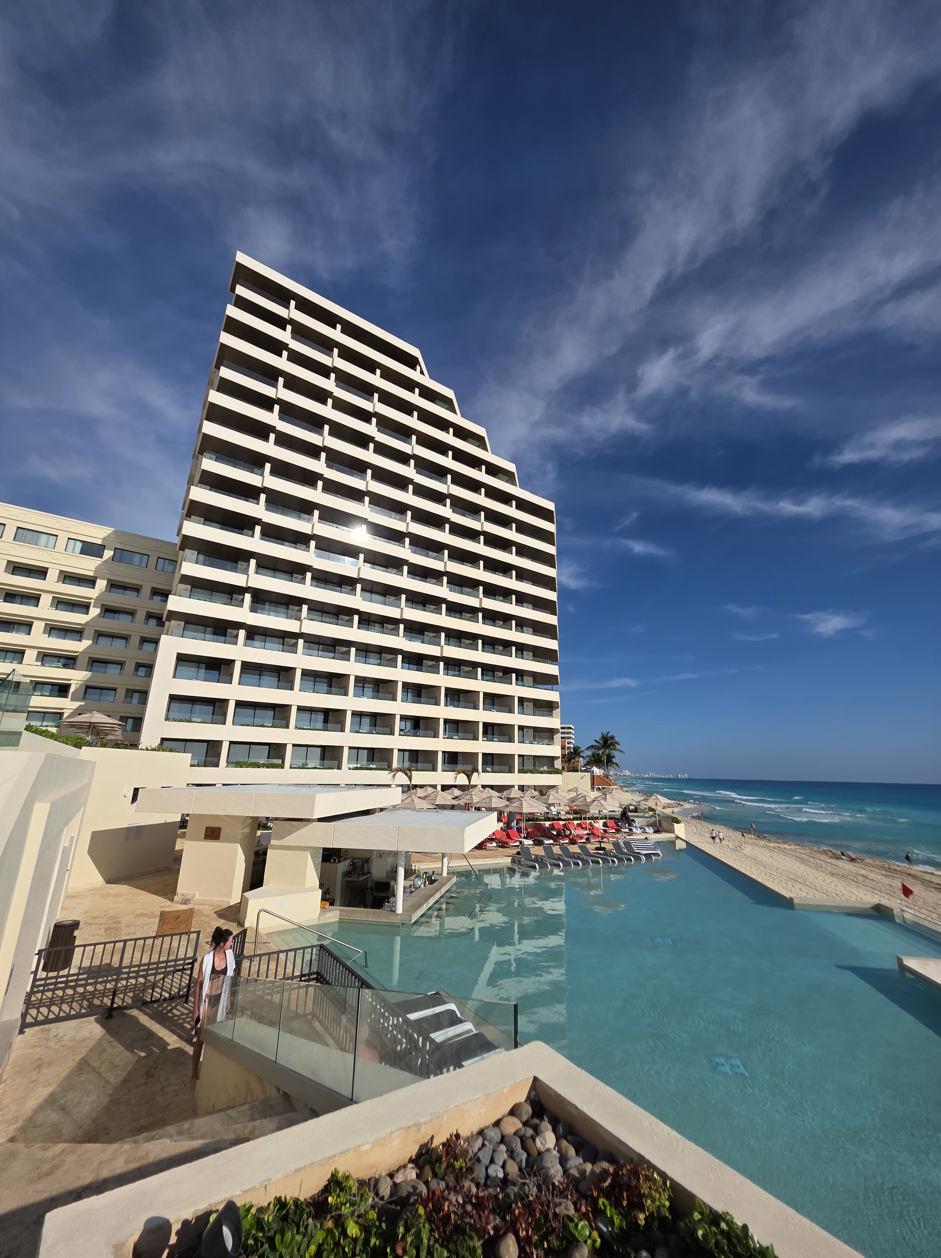 This is the ultimate “VIP” spot on the property. Located on the 7th floor of Building B, the Sky Bar is a refined, breezy oasis with expansive views of the Nichupte lagoon.